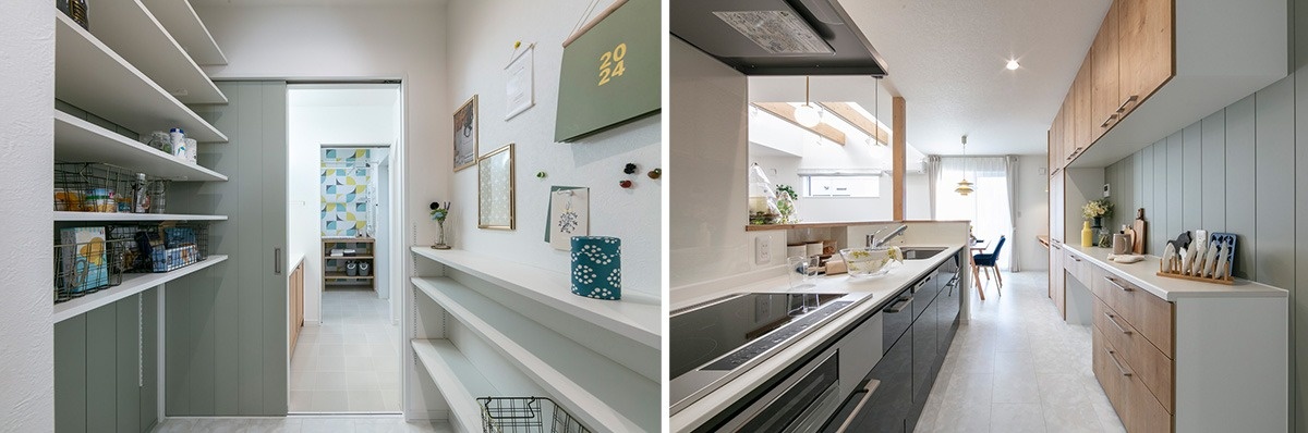 パントリーから見たキッチン。買い出し後の整理や、料理・洗濯など日々の家事がしやすい動線です。(写真右)