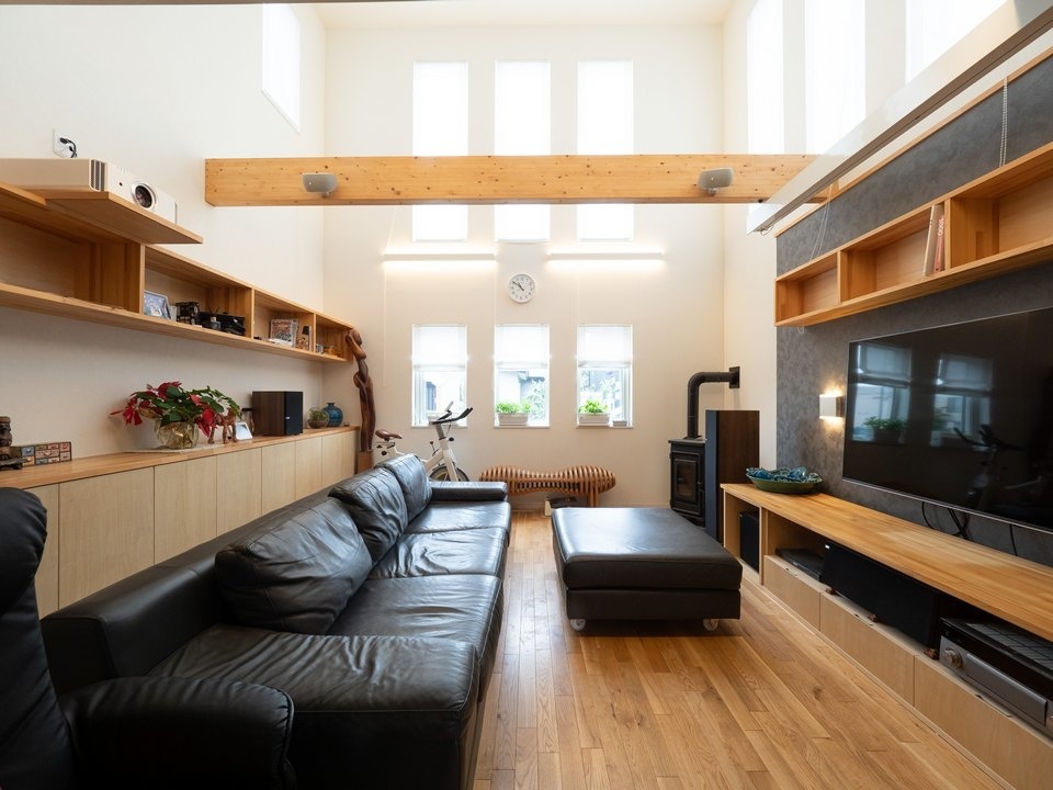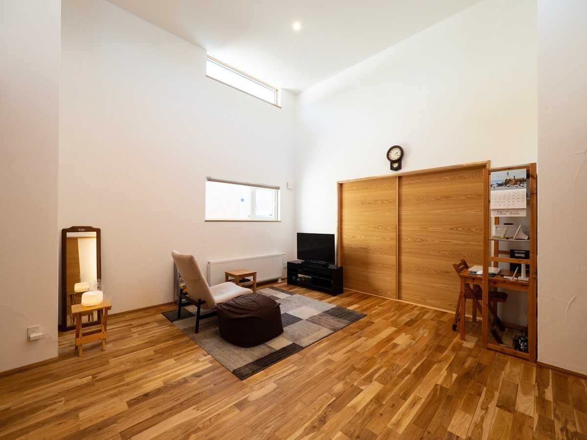 高さ4mを超える吹き抜けのあるLDKを中心に、明るく開放的な住空間が広がっています。「本当に必要なものだけを置くようにしたら、こうなりました」と奥さま。ソファーやコーヒー・テーブルを置かないことで、リビングがより広く感じられます。ナラの無垢材は、床暖房で暖められており、足元はいつもポカポカと快適です。