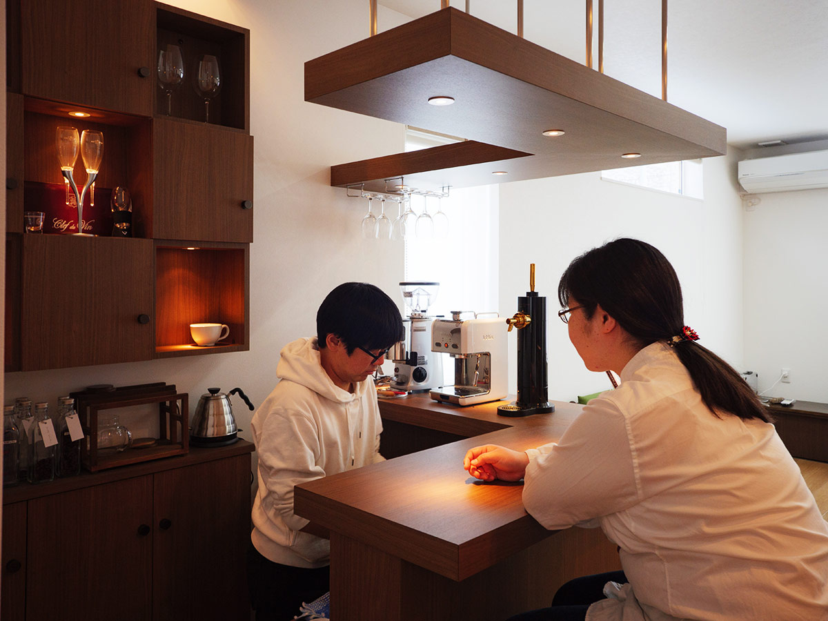 パスタとストックしたワイン。 こだわりのコーヒー。 お気に入りのMusicと午後のティータイム。 ガレージライフ。 Kさんの家は、ご夫婦2人の「好き」がいっぱい詰まった家です。Kさんは、カフェや喫茶店をはしごして研究したぐらいのコーヒー好き。 カフェカウンターを作ることは、家を建てるときに外せない条件でした。
