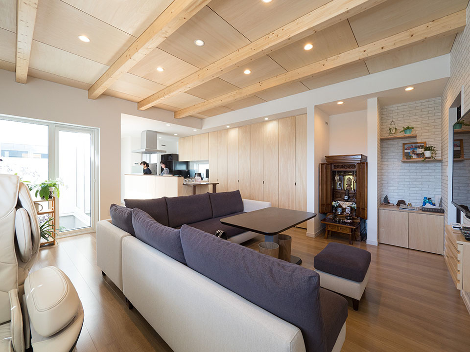 LDKの一面は全て大型扉の造作収納でコーディネート。右手前から収納と飾り棚、仏壇コーナー、収納が続きます。リビングはダイニングと兼用です。広いビルトイン・ガレージを確保するためにはどこかを削らなくてはならず、夫婦二人が寛げる必要最低限のスペースで良いと割り切ったそうです。ゆったりとしたソファーにガス圧昇降式のテーブルの機能的な組み合わせは大正解。ご主人は居心地が良くて食事後に寝てしまうこともあるそうです。
