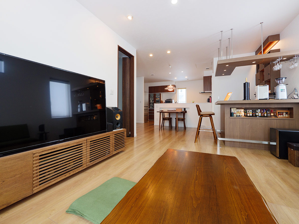 ご主人のもう1つの趣味である音楽。お店にオーダーしたスピーカーで組んだ7.1chのサラウンドシステムに、旭川家具のお店でオーダーしたテレビボード。そして、65インチの大型テレビで良い音と映像を思う存分楽しめます。