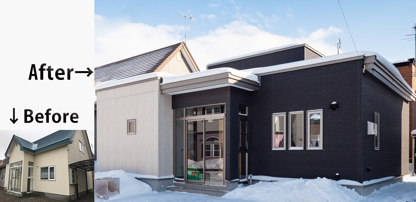 家族構成が変化し、思った以上に広く感じられる住み慣れたわが家。2階を使っていると、階段の上り下りが億劫だし、トイレは1階なので行くのが大変で、つい1階の客間を主寝室に使ってしまいがち…。冬の寒さも身に染みて、思い切って平屋に減築し、高断熱・高気密住宅へとリノベーションしてみたい・・・ 恵庭市のSさんはそんな願いを叶えました。