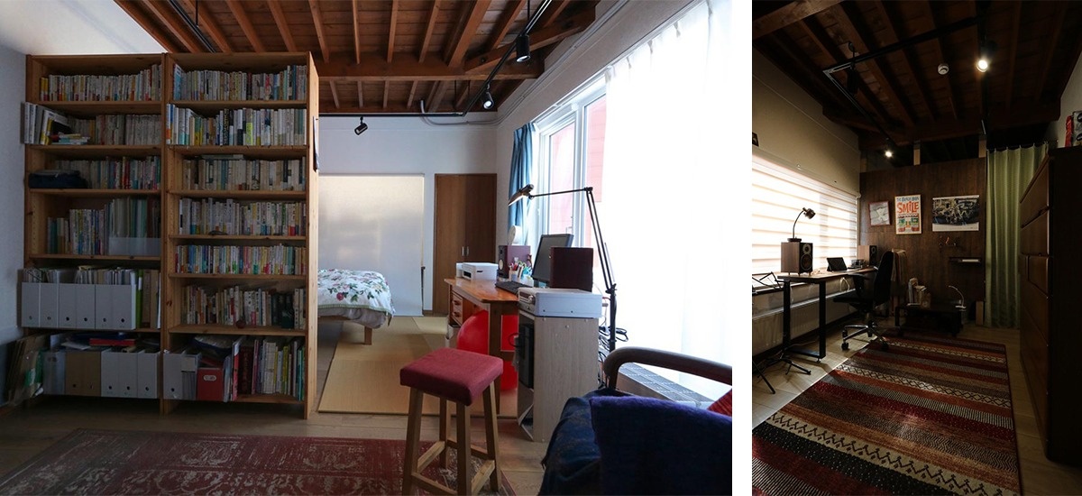 1階には夫婦の個室と、浴室・洗面室があります。写真左は奥さまの部屋。本や仕事の資料がびっしり詰まった本棚を間仕切りにした、知的で落ち着いた空間です。明るい窓際にはデスクを配置しています。現しの天井も良い雰囲気です。写真右側、縦長なAさんの部屋には、DIYで収納を造りました。有孔ボードの奥は、布団を敷いて寝ているご主人の寝具や、衣類がキレイに収まっています。