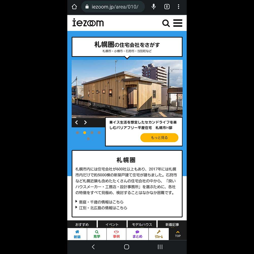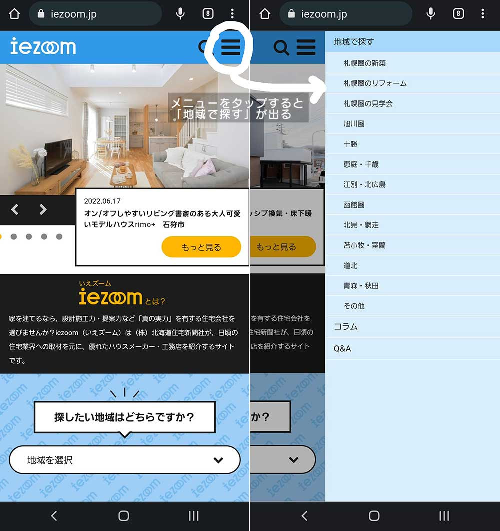 いえズームを開くと、「地域で探す」という虫眼鏡マークがあります。スマホはメニューから「地域で探す」メニューが出てきて、上から札幌圏の新築、札幌圏のリフォーム、見学会、そして旭川十勝、恵庭・千歳と続いています。
