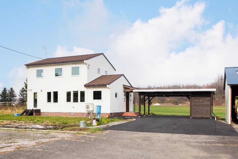 空と畑だけの風景の中に明るい白壁が映えるN様邸。北海道、十勝・音更町で40代のご夫婦と2人のお子さんが暮らしています。ふたつの屋根からカーポートまで続くフォルムが美しく、西洋を思わせる十勝の風景によく馴染む外観です。