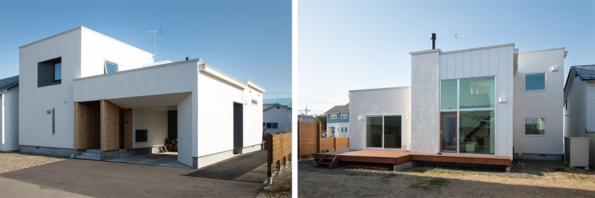 外観は、北側道路の土地を購入し、南側の窓を大きくしてもらって、カーテンを開けて過ごせる家を希望し、それが実現しました。敷地の道路側に家を配置することで除雪の負担を軽減したり、家と物置とを一体化したカーポート(ビルトインガレージ)を提案してくれたり。外壁の色は白か黒かで迷いましたが、室内を白基調にしたので白に決めました。