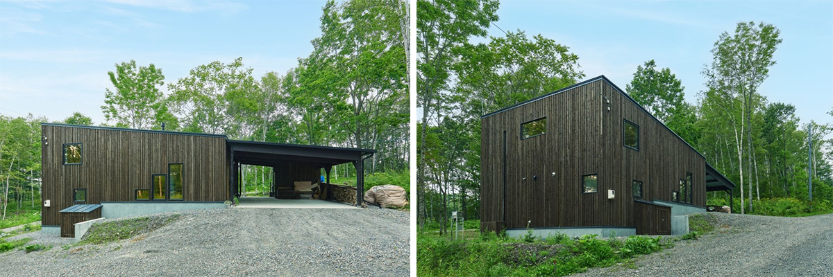 鹿やエゾリスの姿が見られることもあるという雑木林を背景に建てた家は、音更町の水野建設による施工。道産カラマツにガルバリウム鋼板を合わせたシャープなデザインに仕上げました。
