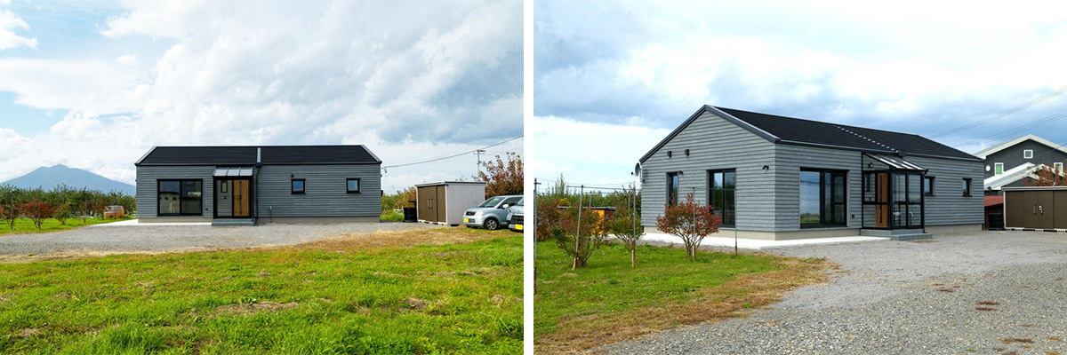 岩木山とりんご畑を背景に、切妻屋根がシンプルな平屋の家が建っています。グレイッシュカラーで彩色した杉板張りの外壁がモダンな印象を与えています。多雪地帯のため、屋根にはスノーストッパールーフを、玄関には風除室を設置しました。