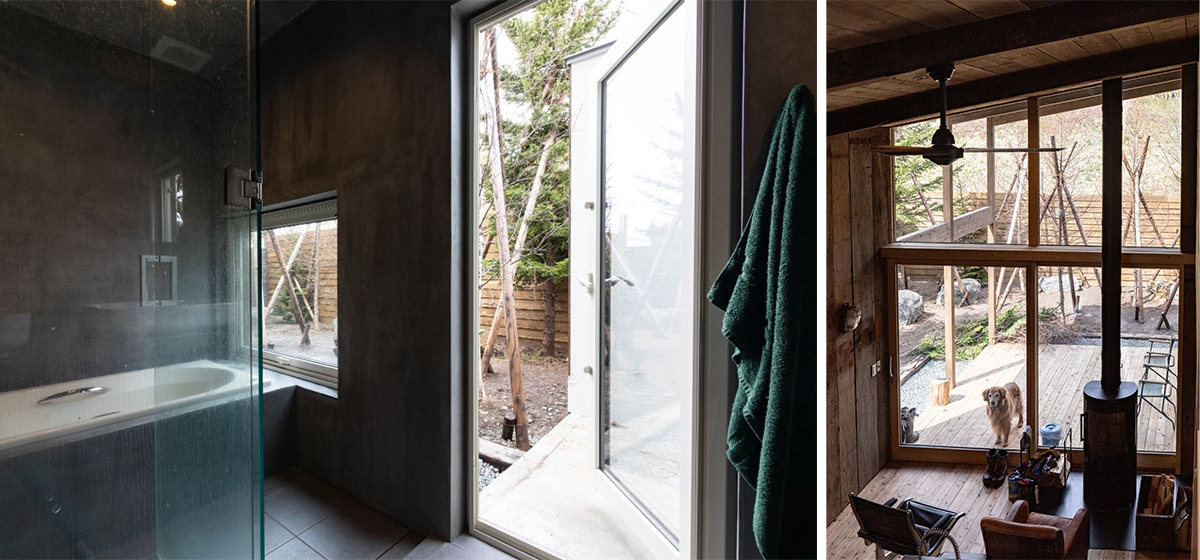 大きな窓越しに、わんちゃんが憩うカラマツの木陰や、大きな石がある「森」が広がります。