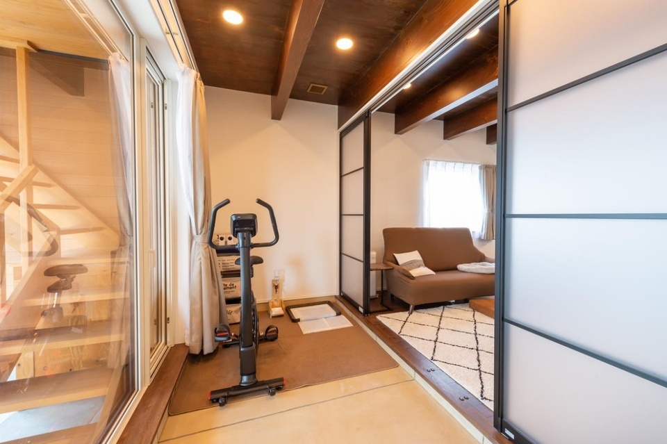 ふすま風の引き戸の先には土間スペースを設置。リビングと一体で利用できる半屋外空間となっており、愛犬のぽんちゃんのハウスやフィットネスバイクを設置しています。土間スペースはアウトドア用具やグッズの保管・ディスプレイや、カフェスペースとしても利用できます。