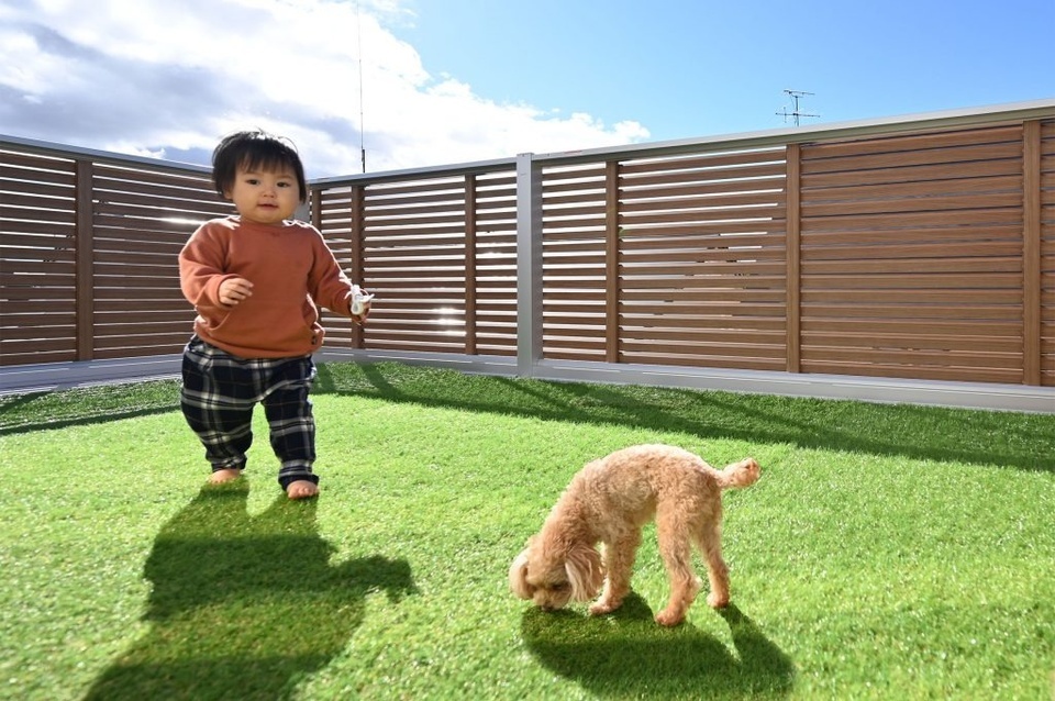 奥様のお部屋の窓側に設けたインナーテラスは大切なワンちゃんのためのスペース。そこから外に出ると、テラスと人工芝のスペースがあり、外でも室内でもワンちゃんが自由に遊べるようになっています。