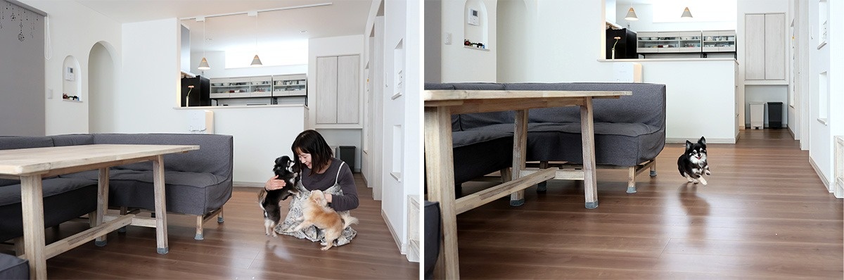 ロングコートチワワのラピちゃん(左)、アウルちゃん(右)のために、LDKはペット用フロアを採用