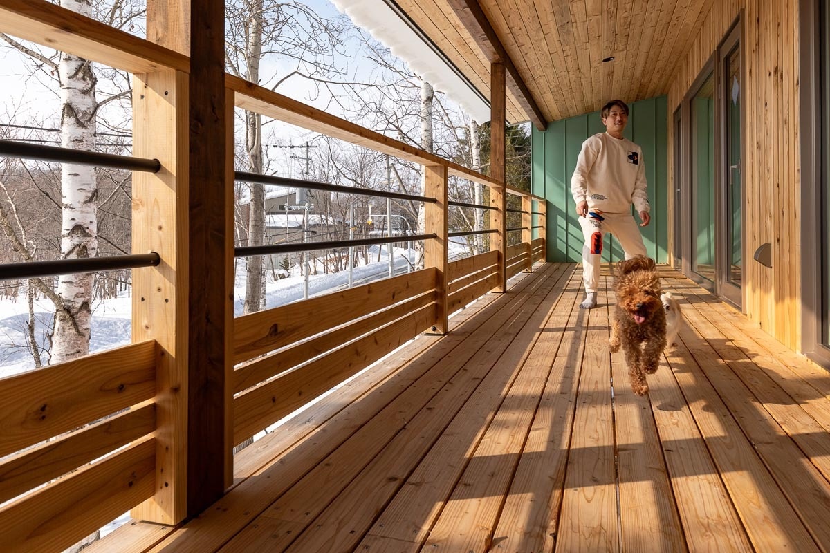 オーナーのYさんは旭川市内にある犬のアフターケアプロショップ「DENI'S STORE」の店主です。このご自宅は、家族の住まいであることはもちろんですが、家の前には断熱を施したコンテナがあり、ドッグフードが保管されています。裏手には、お客様の愛犬を休ませるお庭も。忙しい仕事の合間に寛ぎつつ、仕事とも連動できる家になりました。