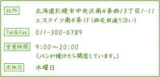 ここは大人向けかな・・・。北海道産小麦へのこだわり。店内も綺麗。本店は札幌市中央区北2条東3丁目2-4で、駐車場はない。バスセンターとかファクトリー周辺のサラリーマンが仕事帰りに寄るには良さそうな立地。丸井今井やパセオ内にもあるようです。