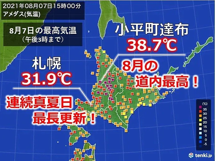 気象庁によると、札幌では7月中旬頃から最高気温30℃前後の日が出始め、7月下旬からは18日連続の真夏日(最高気温が30℃以上の日)を記録。1924年(大正13年)の17日連続記録を97年ぶりに上回りました。夜になっても気温があまり下がらず、熱帯夜で寝苦しい夜になった日もありました。