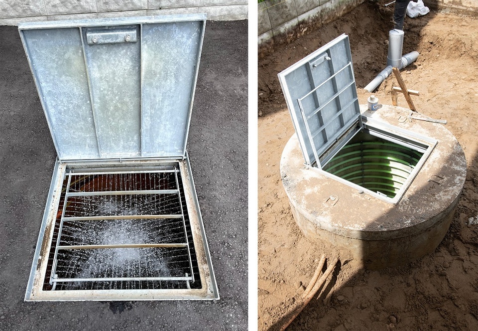 左/融雪槽の蓋を開けると、中は地下水が噴射されています。冬はこの地下水を使って融雪を行います。右/地下水が入る前の融雪槽。内部は半径120cm・高さ150cmの大容量です。建物の床下へと繋がる不凍液を入れた架橋ポリエチレン管が融雪槽の内側にグルグルと巻き付けられています。