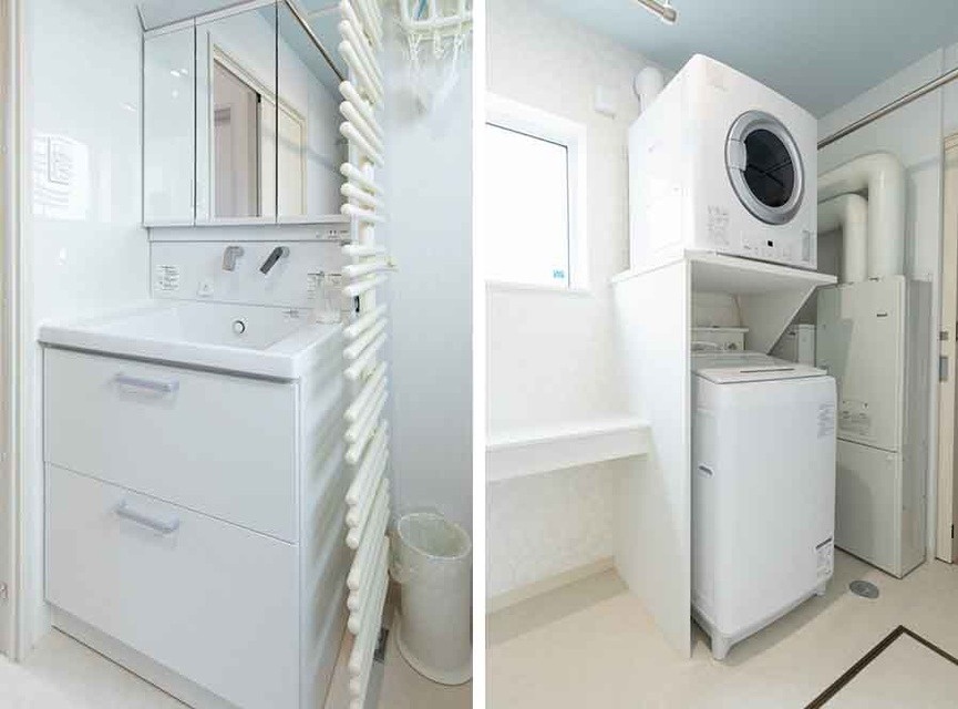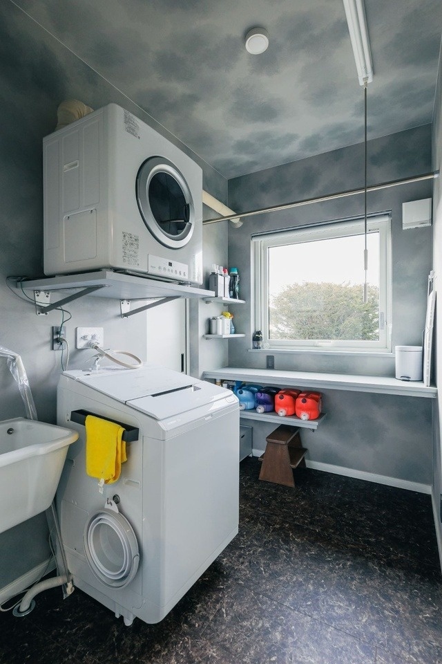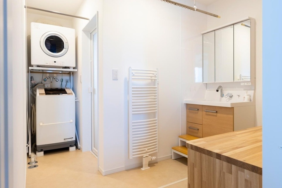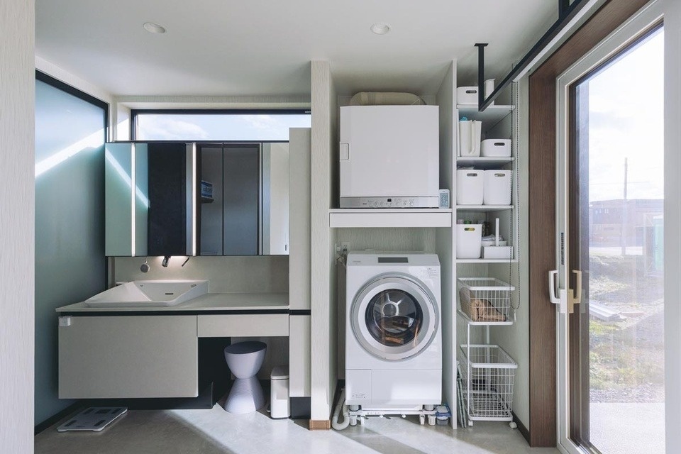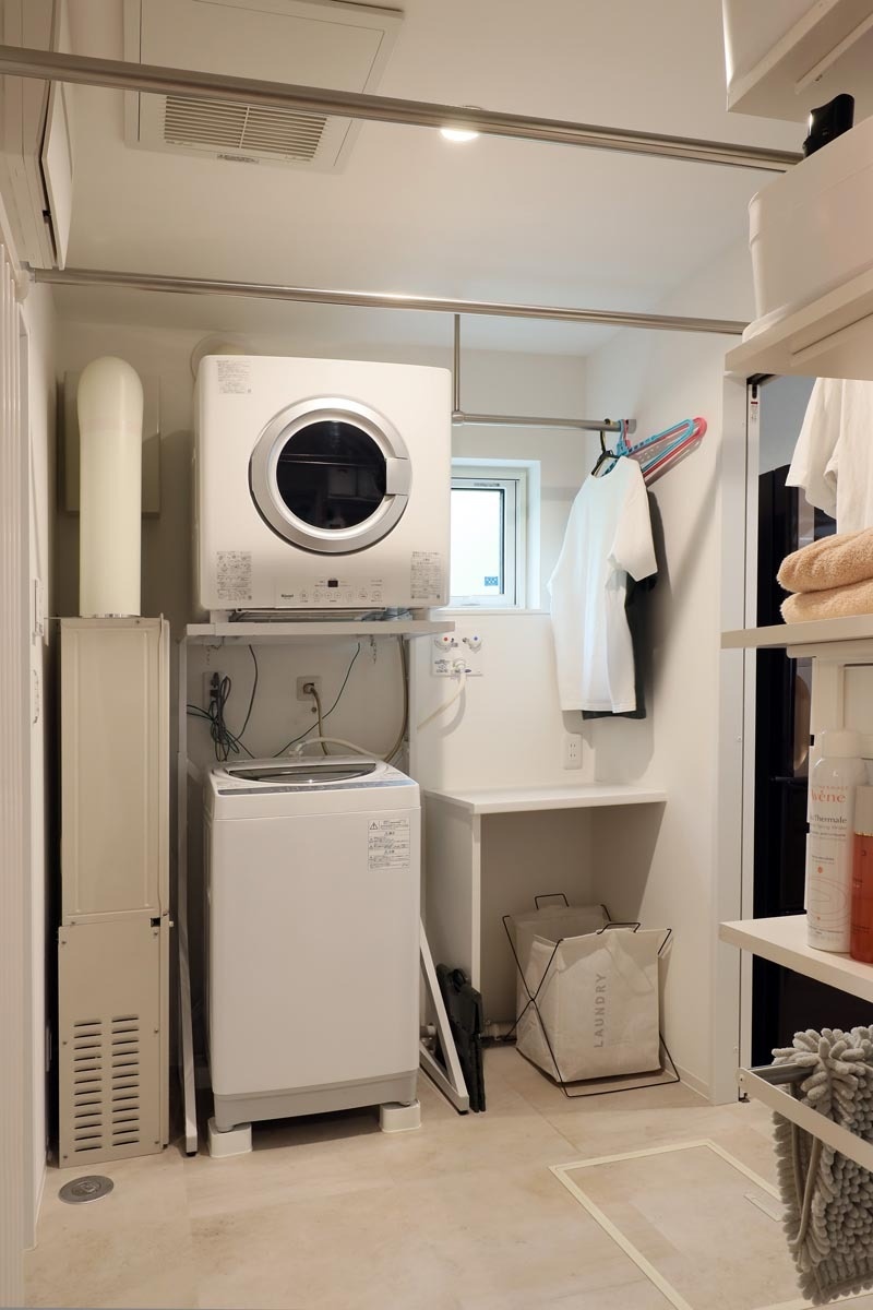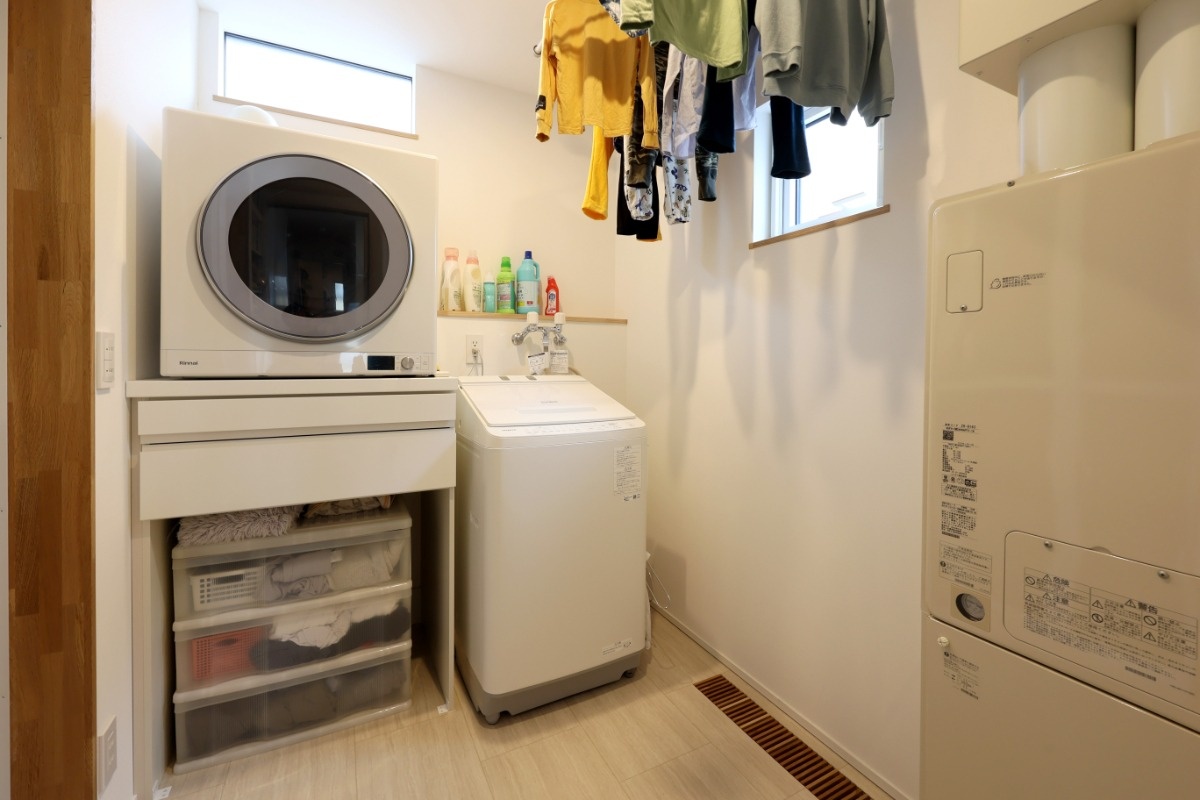 手前にあるのは知人に勧められて選んだというガス乾燥機の乾太くん(リンナイ)。「乾燥力がとにかくパワフルです。安物の子ども服などが縮んでしまう点は注意が必要ですが、家事負担は大幅に削減できます」(ご主人)