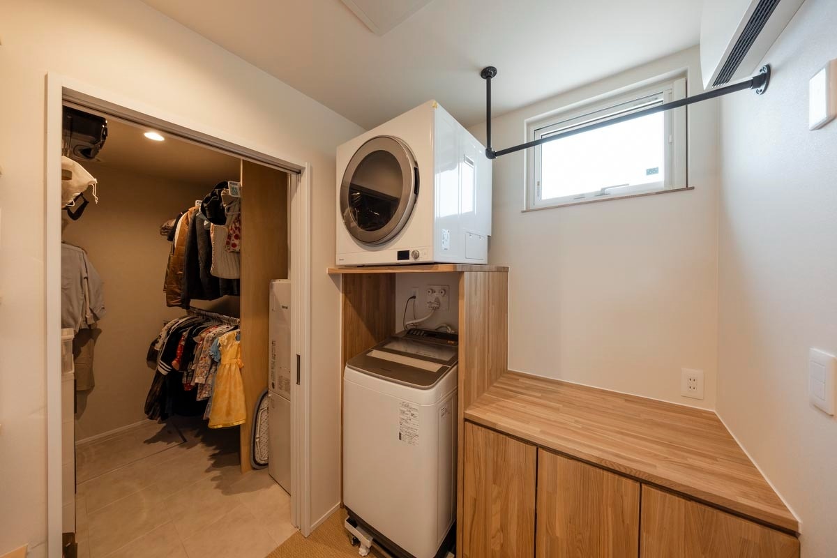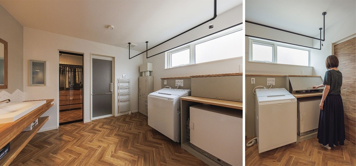 窓のある壁面にはアイロンがけや洗濯物を畳むのに便利な作業台を設置しました。洗濯機に加えて奥さまが気に入っているのがガス乾燥機の「乾太くん」。洗濯→乾燥→畳む・アイロンがけまでを一カ所でできる理想のスペースになりました。