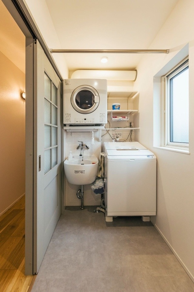 洗濯機の隣にはSKシンクを設置。汚れ物はつけ置きや予洗いの後、すぐに洗濯機に入れることができるようにしました。その上にあるのはガス乾燥機「乾太くん」。「評判が良かったので採用しましたが期待どおり」(奥様)と、その乾燥力で家事の時短に貢献しているそうです。