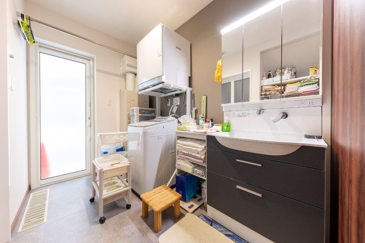 洗面脱衣室には、奥さま希望のガス式衣類乾燥機「乾太くん」を設置しました。洗面室との境目にあるロールスクリーンを下ろせば、脱衣スペースを独立させることも可能です。
