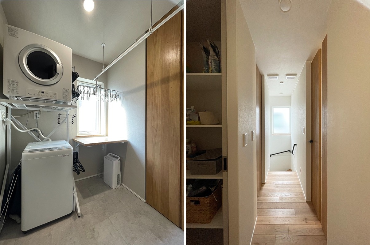左手の引き戸の先にはユーティリティーがあります。奥さまの希望で、「ガス式乾燥機 乾太くん」と既成の収納棚を配置。
