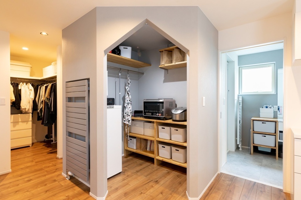 三角の下がり壁が付いたパントリーには、キッチン家電や冷凍庫を収めています。「キッチンの背面カウンターには物を置かず、生活感が出ないようにしたかった」とご主人。
