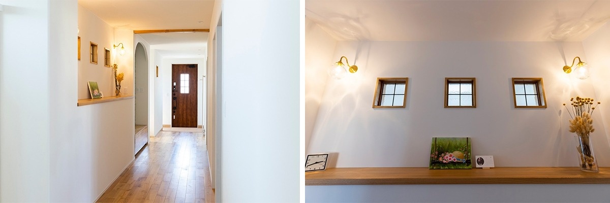 玄関ホールや廊下、キッチンに付けた小窓がアクセントになっています。室内5カ所に付けた小窓は、すべて正方形で統一してリズミカルに。表面がゆらめいて見える波ガラスを使用しています。