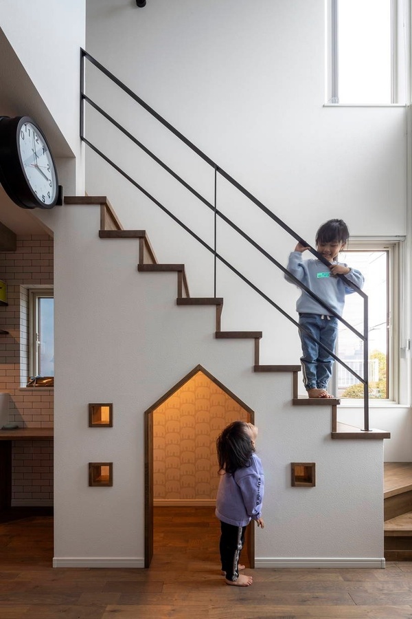 リビング階段の下には家型の垂れ壁がかわいらしい隠れ家スペースが。センスと遊び心が光るLDKです。