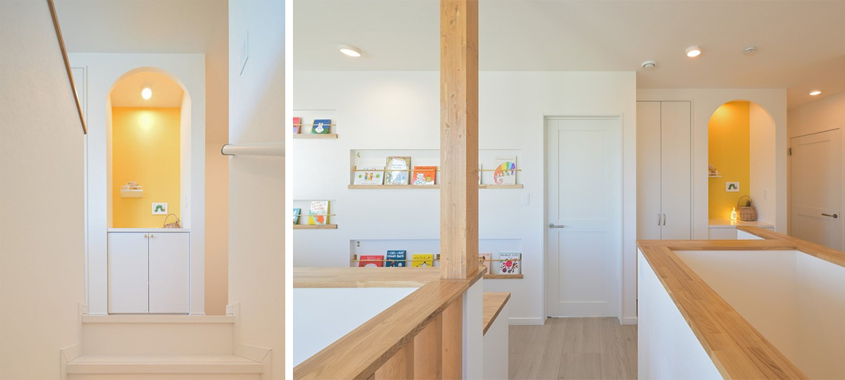 2階ホールにはお子さんの描いた絵や、写真などが飾れるようにと、マグネットの貼り付けが可能なギャラリーコーナーを設けました。ラウンドの下がり壁にイエローのアクセントクロスが可愛らしいスペース。ここを通るたびに家族の思い出を見返すことができそうです。