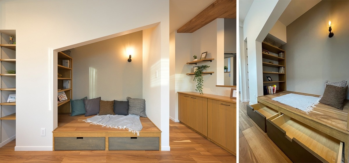 中には本などを収納できる造作棚も。床下には、お子さんのおもちゃ収納などにも最適な大容量の引き出しも備えています。