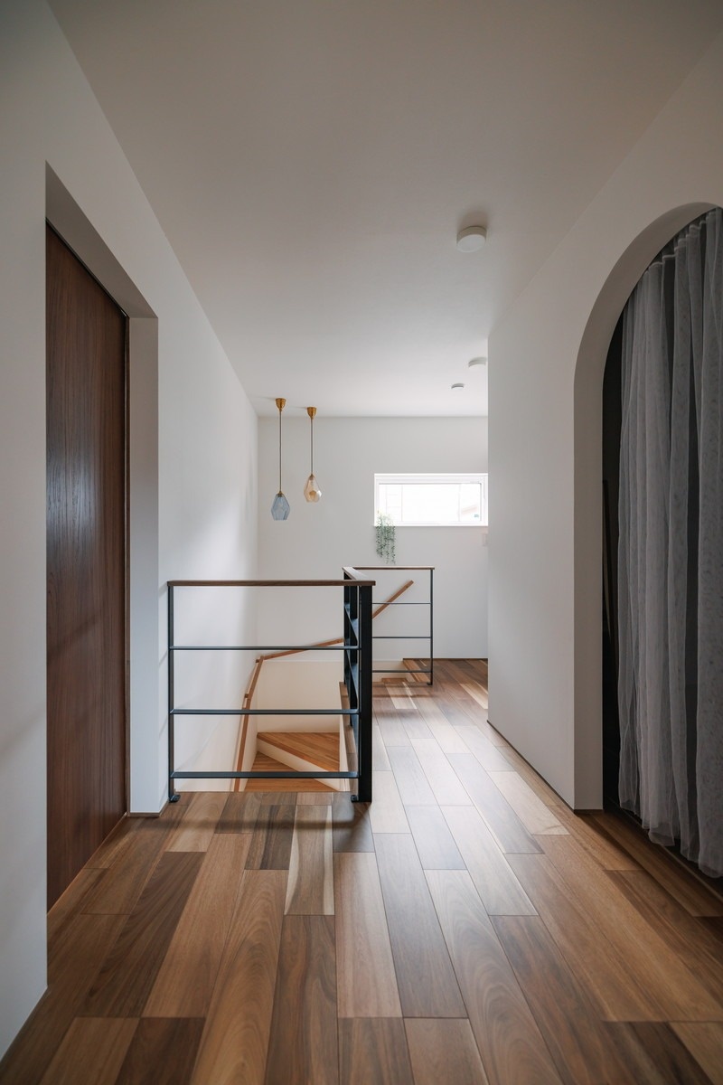 連続するアーチで美しく彩られた廊下。アール状の下がり壁や、イエローのアクセントクロスが、奥さまこだわりのプライベートな空間にかわいらしさを添えています。