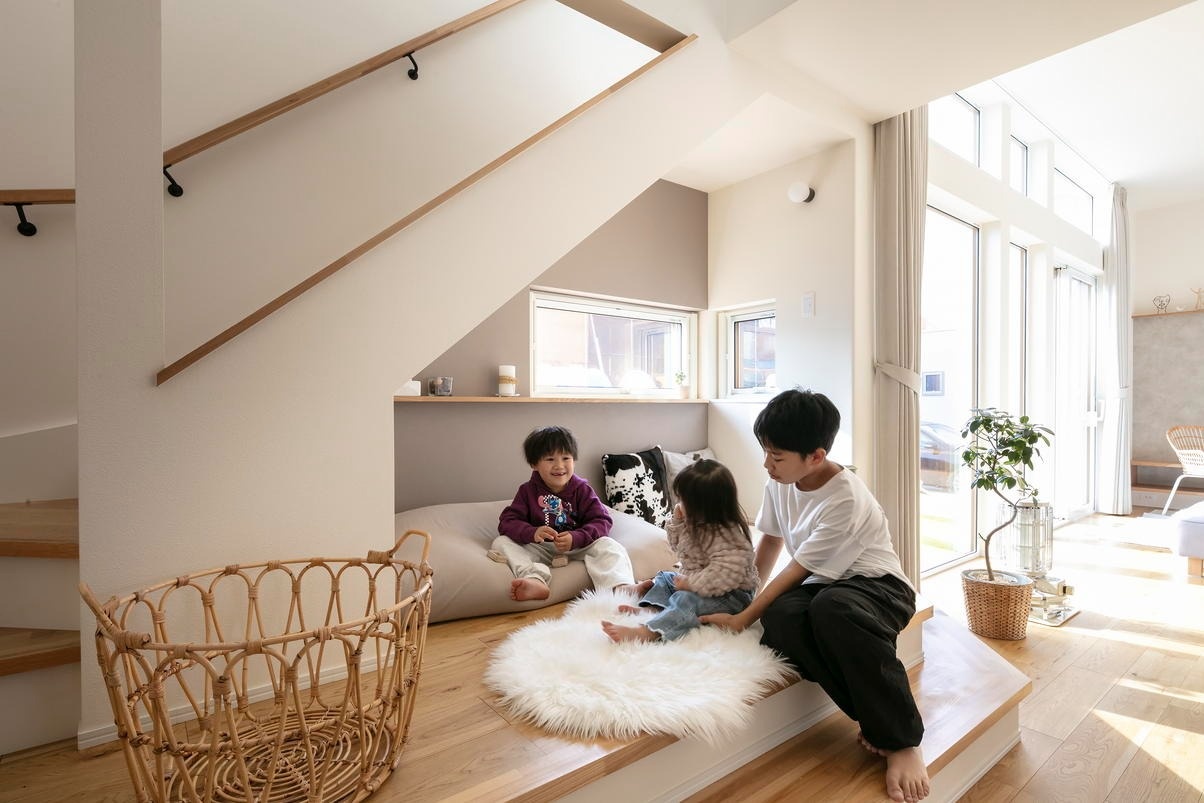 リビングの一角は階段下を利用したヌックになっています。読書やお昼寝といった「一人時間」を過ごしたり、お子さんのプレイスペースにしたりと、同じ空間で家族と過ごしつつも、ちょっとした「おこもり」が叶います。