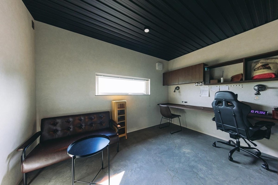 農家の3代目であるKさんは2022年6月、帯広市郊外にインダストリアルスタイルの平屋住宅を建てました。ご主人の書斎は、天井に倉庫などに使用するトタンを、床にはクラック柄の入ったモルタル風フロア「クラックモルタル」(サンゲツ)を使用。快適なワークスペースでありながらどこかガレージ風に仕上がっています。