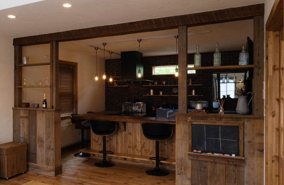キッチンとダイニングの間の天井梁には、大正時代の農家の納屋を解体した際に保存しておいた100年ものの古材を採用。腰壁部分の羽目板、柱部分の木材も木目や色味、太さのバランスを考えてデザインしました。