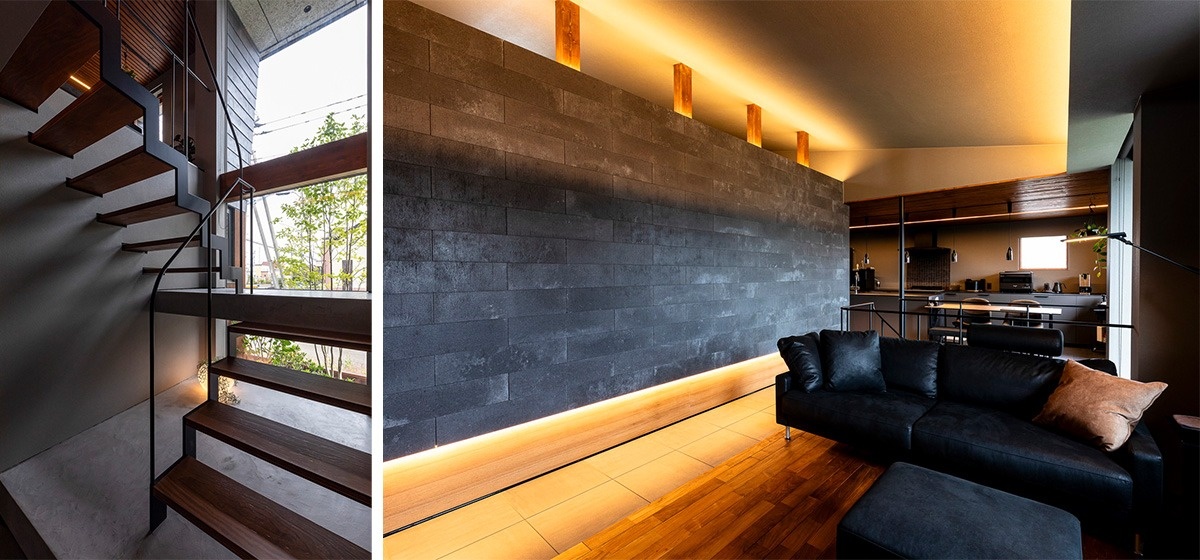 通路沿いの壁には、2階部分の外装にも使われているシングルスレートを貼り、間接照明をプラン。ラグジュアリーな空間に仕上がりました。