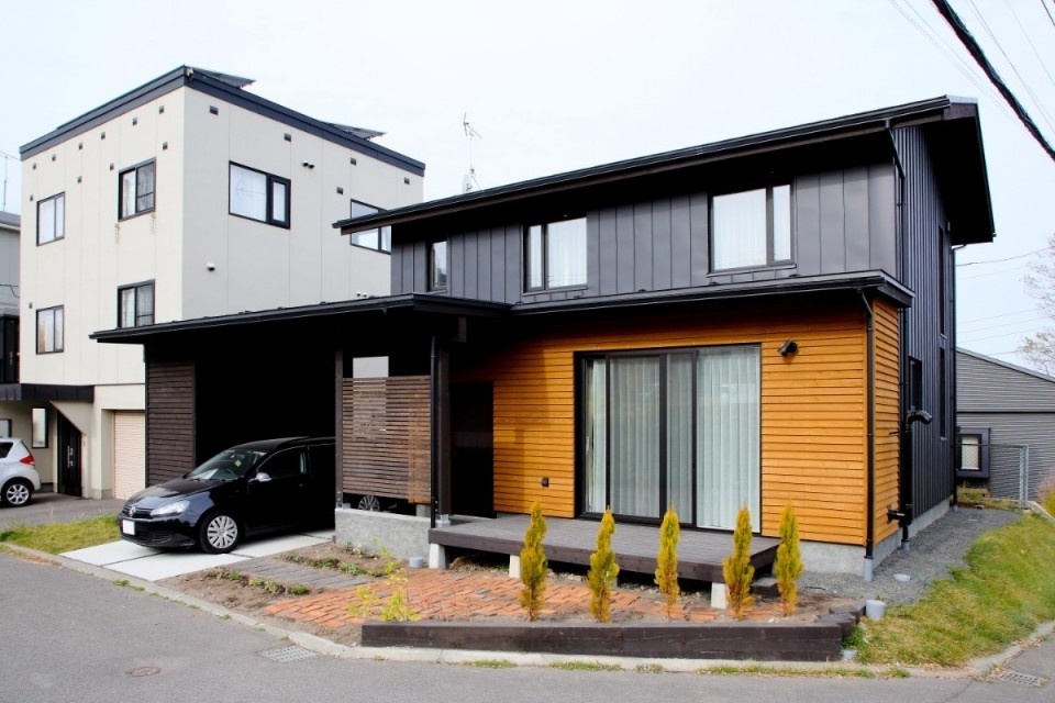小樽市内の小高い丘の上に、そのおうちはありました。外壁はブラックのガルバリウムと、道南杉の板張りの組み合わせ。ナチュラルな風合いを感じる住宅が多い丸三ホクシン建設ですが、C邸は施主の要望も加わって、シャープな印象が強い外観デザインになりました。外壁全体を板張りする仕様も魅力的でしたが、年数が経過したときに、施主自ら板張り部分を塗装するメンテナンスができるように、手の届く範囲だけを板張りにしました。