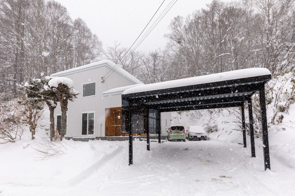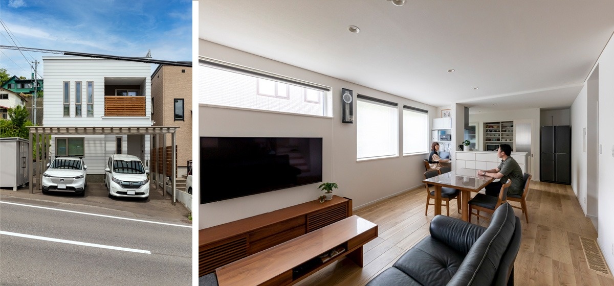 小樽市にあるTさん夫妻の家は2022年秋に竣工しました。JR函館線の駅にも歩いて通いやすい住宅街の一角、奥には静かな林が広がる場所にTさん夫妻の家は建っています。