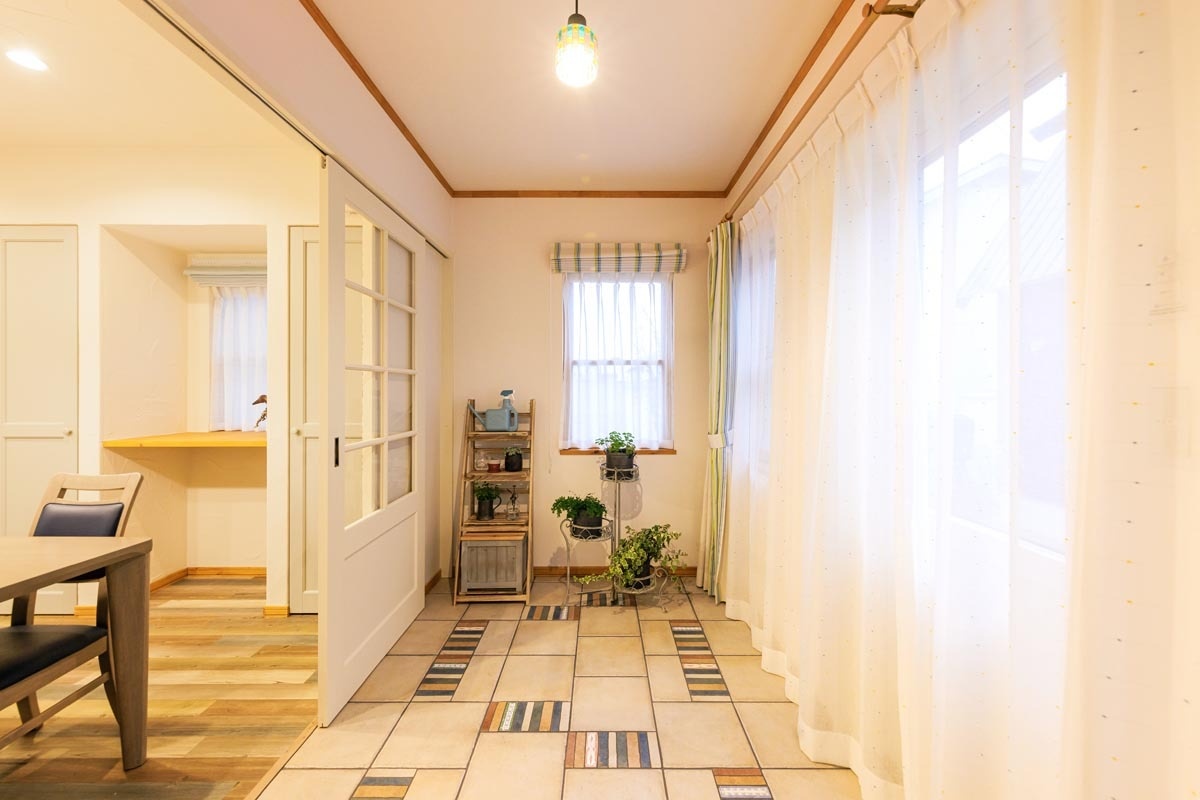 奥さまのお部屋続きのサンルームは、既存のテラスを変更したもの。このサンルームと玄関には、床暖房を採用しています。「洗面室に洗濯物を干すのがいやで、サンルームを活用しています。換気扇とサーキュレーターで、朝干したら午前中に乾くので快適ですよ」。