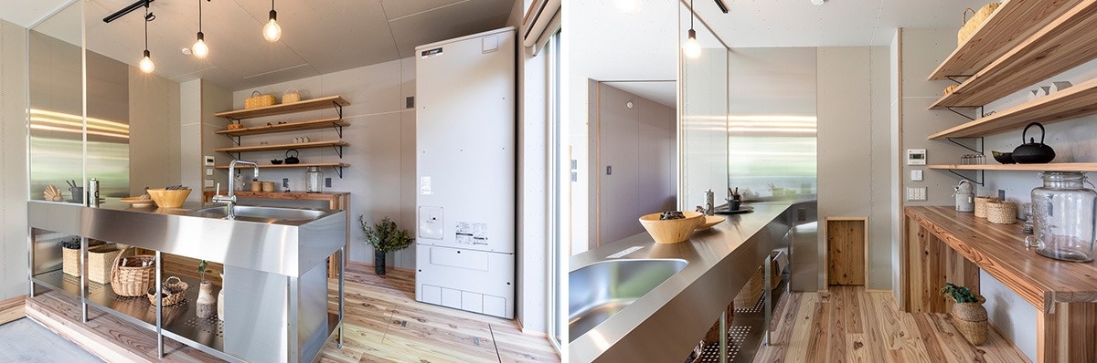 キッチンは奥さまの希望でステンレスと天板のみのシンプルな造りに。右奥にあるのは給湯器のエコキュートです。できるだけ自家発電でまかなうため、2階ウォークインクローゼット内に蓄電池も備えています。