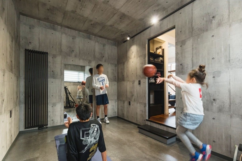 「誰にも気兼ねなく練習することができるし、床がコンクリートなので、ドリブルの感触も体育館の感覚に近い手応え。外と違ってボールも傷みません」とバスケ部の息子さんも大満足。LDKにも近い位置にあるため、将来的には寝室にすることも視野に入れているそうです。