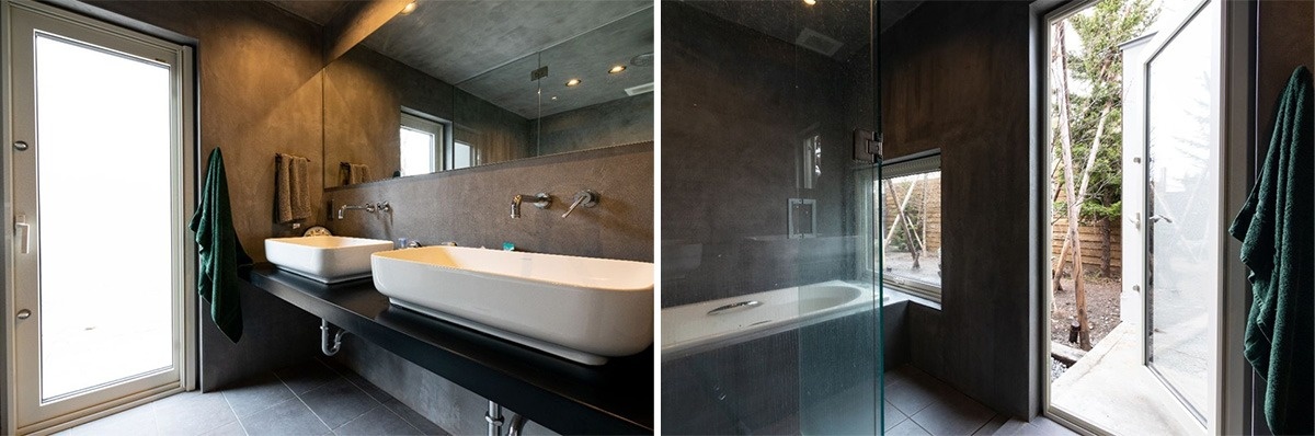 スタイリッシュな洗面所は、庭に直結。犬の汚れを落としてから室内に入れるよう、動線を工夫しました。