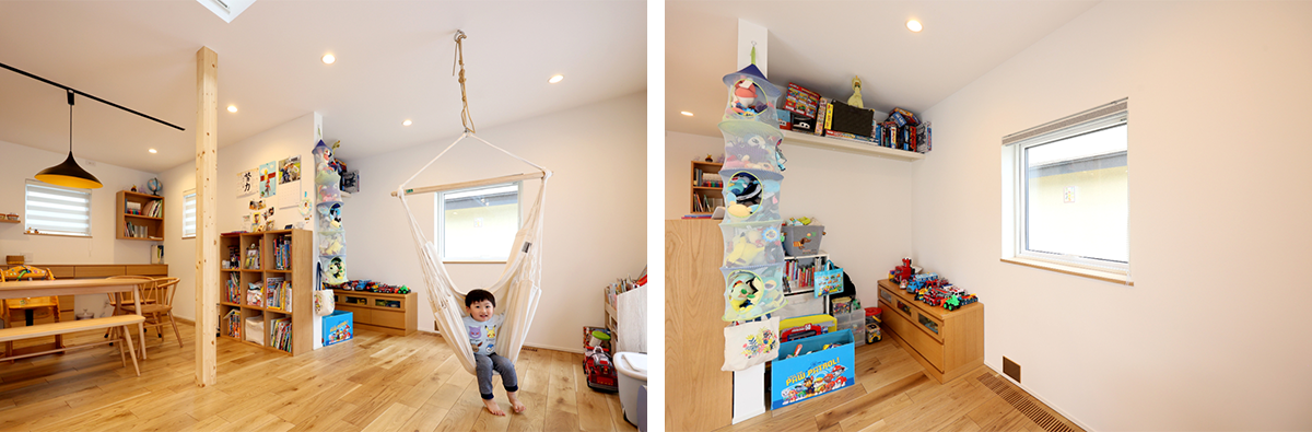 キッズスペースのハンモックは下のお子さんのお気に入りスポット。キッズスペースとダイニングを仕切る壁面はマグネット壁になっており、お子さんの絵や家族の写真などが飾れるようになっています。奥にはおもちゃをしまっておけるスペースも確保しました。