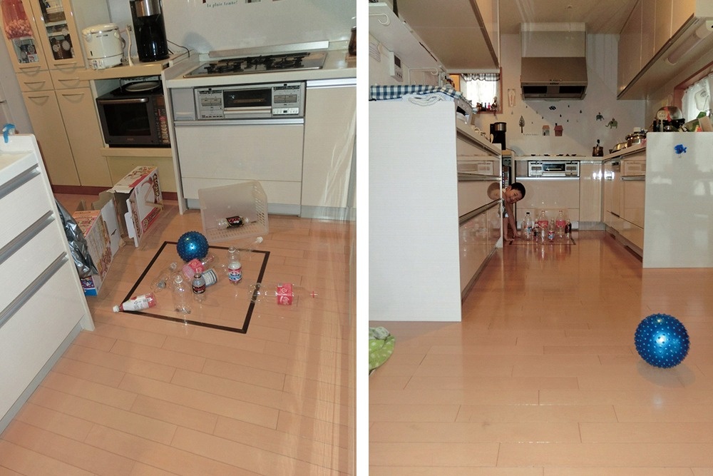 用意するものは空いたペットボトル6~10本とゴムボール。ボトルは大きさなんてバラバラでも倒れればOKです。レーンになりそうな通路があれば、すぐにできます。