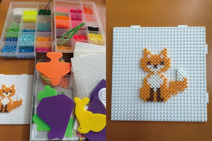 アイロンビーズは本当によくやっていました。色合わせやデザインなど、五感を刺激してくれるアートな遊びです。写真のキツネが乗っている白いプレートを4枚組み合わせて、大きな作品をつくることもできました。出来上がった作品は額に入れて部屋に飾ったりと、大人も一緒に楽しめます。ビーズを並べたらクッキングシートを乗せて低温のアイロンで熱して固めるという仕上げ方も面白かったです。