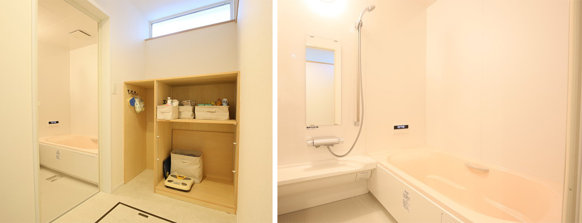 浴室の下半分は既製品のユニットバス(ハーフユニット)で、壁や扉、天井などは大工さんの造作です。自然素材をふんだんに使った家でも、お風呂は工業製品という家が大半ですが、萬田さん宅のお風呂は壁にヒバを採用しており、木の香りでほっとする空間に。自然素材だと掃除が大変そうですが、同じようにヒバを採用した清水さんのご自宅も「塗料を5年に一回くらい塗れば黒カビの発生を抑えられます」とのことでした。