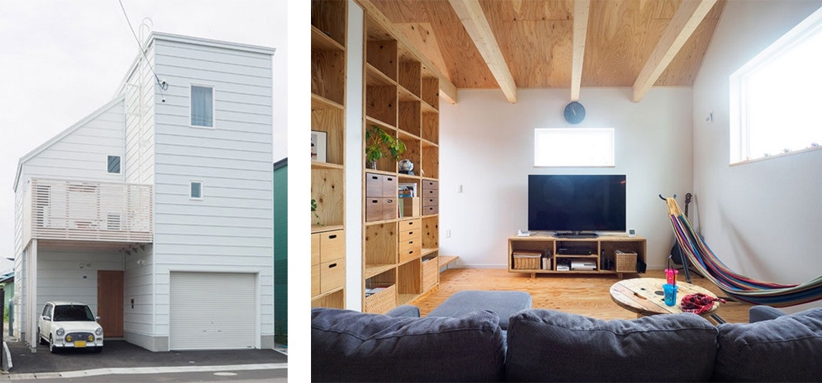 昭和50年代から平成年代まで20年以上にわたって札幌にたくさん建った1階車庫、2,3階に木造の住宅という3階建て住宅。コンクリート造の1階はガレージと収納スペースで、多くの場合は2,3階だけが住居スペースです。