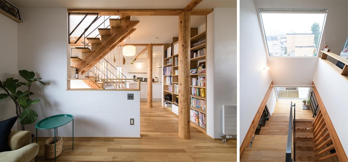 階段は、K邸にとって主役ともいえる場所。3階までの吹き抜けです。2階から3階へと向かう途中の踊り場は、正面の大きな窓からの採光はもちろん、見晴らしも抜群です。長女が小さな机を置いて、いつもと気分を換えたスタディ・スペースになることも。春になると向かいの公園の桜が見えてお花見もでき、家族のお気に入りスポットです。