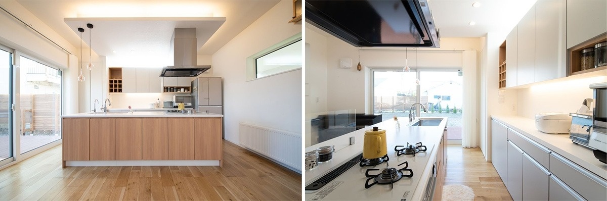 キッチンは調理スペースに余裕があり、二人向かい合って作業できる形。元々料理好きだったというご主人も、「このキッチンになってからますます料理することが多くなりました」と笑顔です。