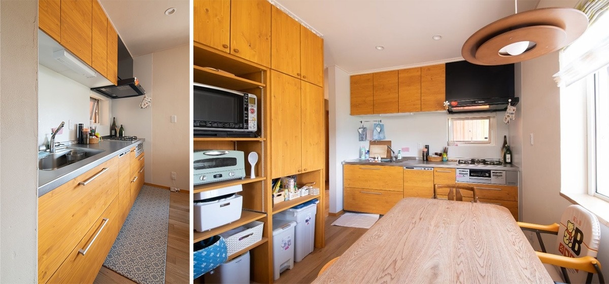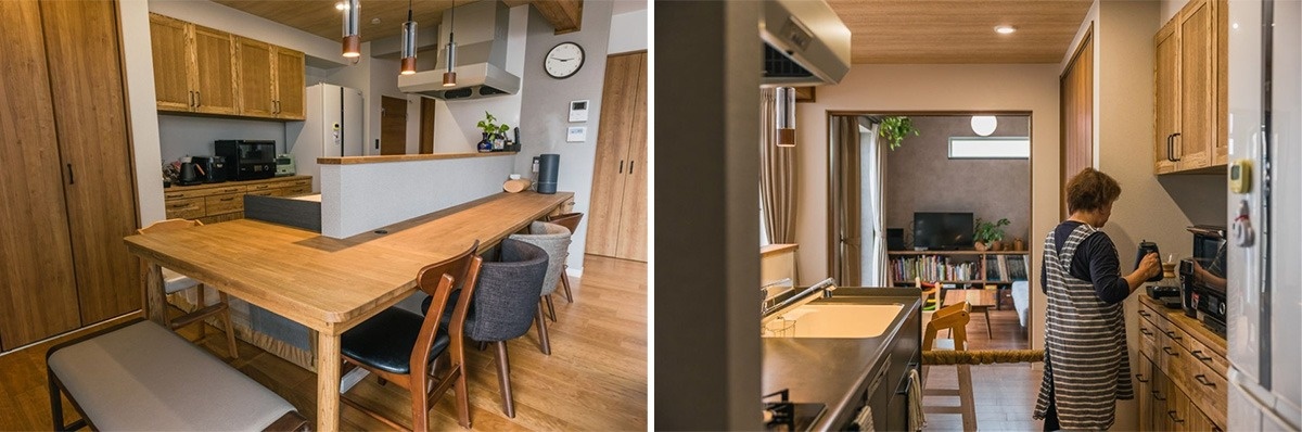 そば打ちやパン作りなど多彩な趣味をお持ちのお母様。キッチンは調理器具がぎっしり入る大容量の収納など、お母様の要望を中心にプランを練りました。「自室にもそば打ちの台を作ってもらいました」と笑顔です。