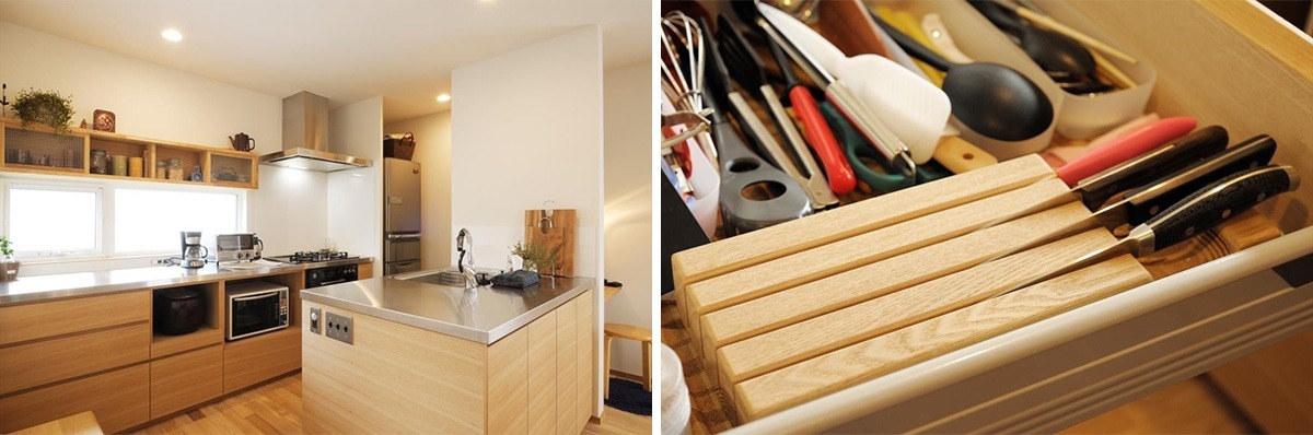 「これも見てください!」と奥様が見せてくれたのは、キッチンの引き出しの中に収められていた長いパン切り包丁も入る包丁立て。なんと、これも大工さんの手作りでタモ材で作られています。